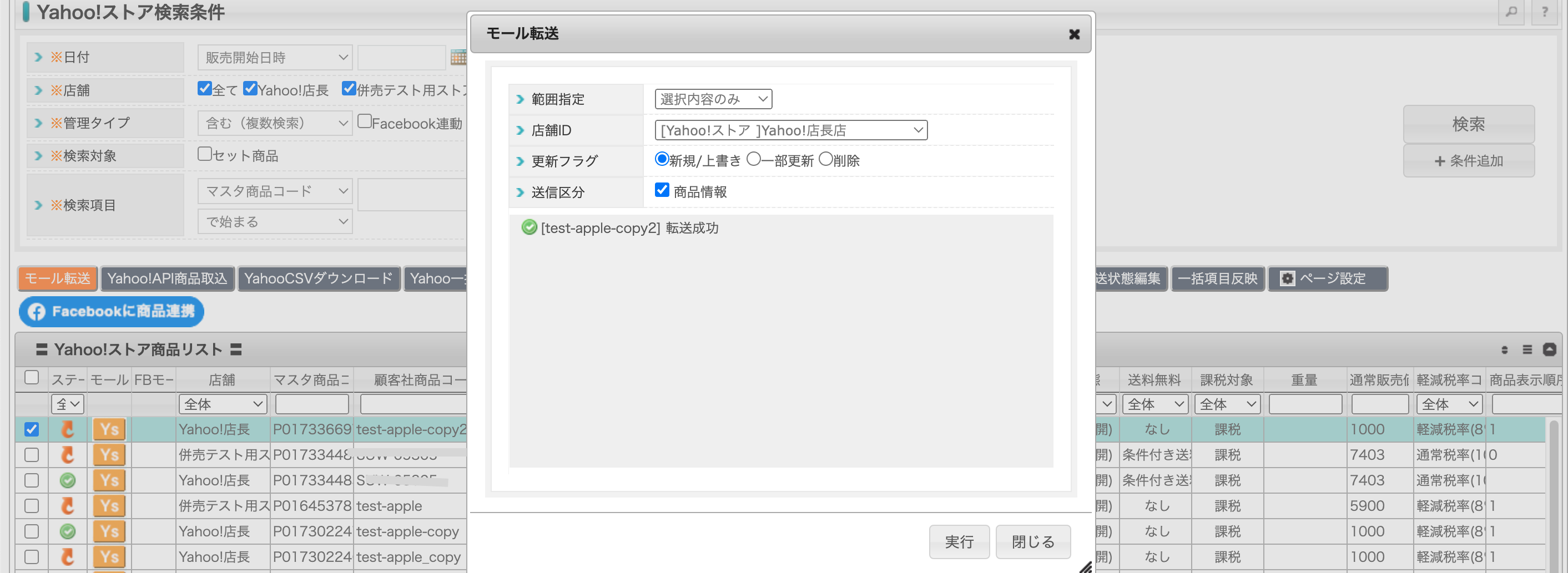 ②転送成功と表示が出ますと、商品データがヤフーストアクリエイターProへ送信されます。