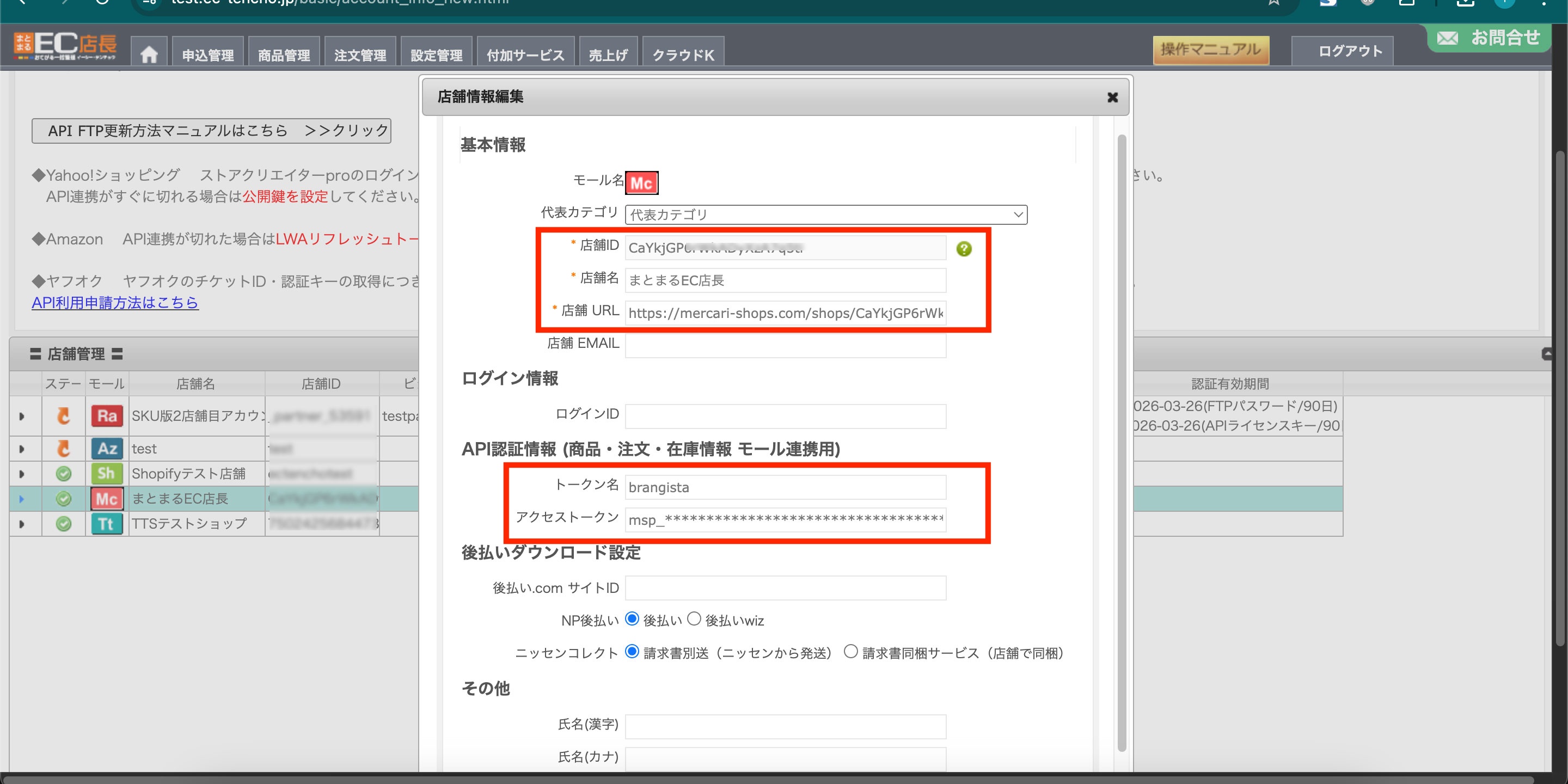 店舗情報編集画面が表示されますので、必須情報とAPI認証情報を入力し「実行」ボタンをクリック