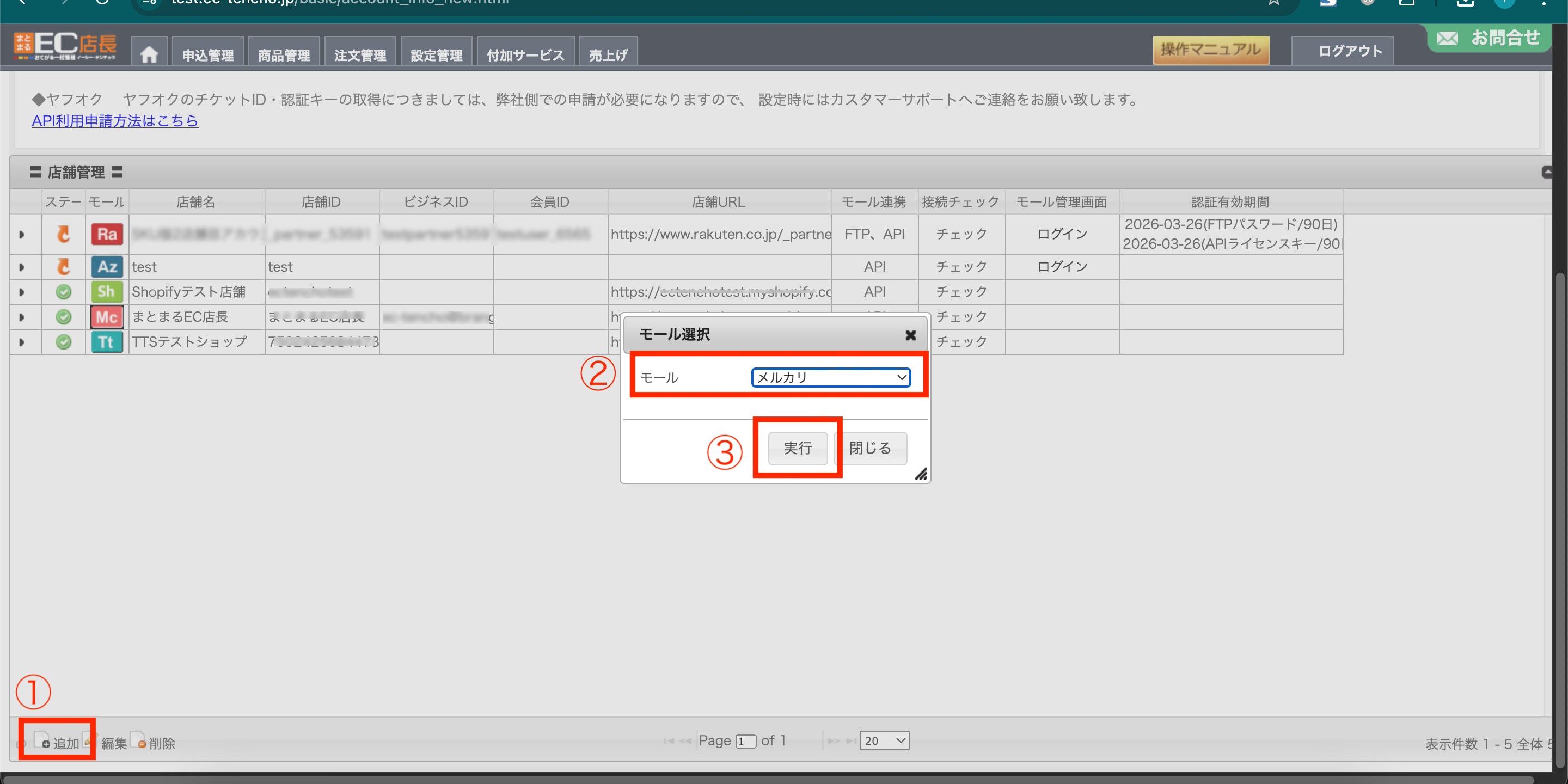 メルカリShopsの店舗追加する場合は、申込管理の店舗管理にて下記の作業を行なってください。